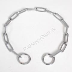 Chromový reťazový stahovací obojok s veľkými oválnymi okami (vonkajšie rozmery oka 40 x 14 mm). Vyrobený z pevného materiálu s priemerom drôtu 3,8 mm. Všetky časti sú zvarené, aby sa dosiahla maximálna pevnosť. Koncové guľaté oká majú vonkajší priemer 34 mm.
